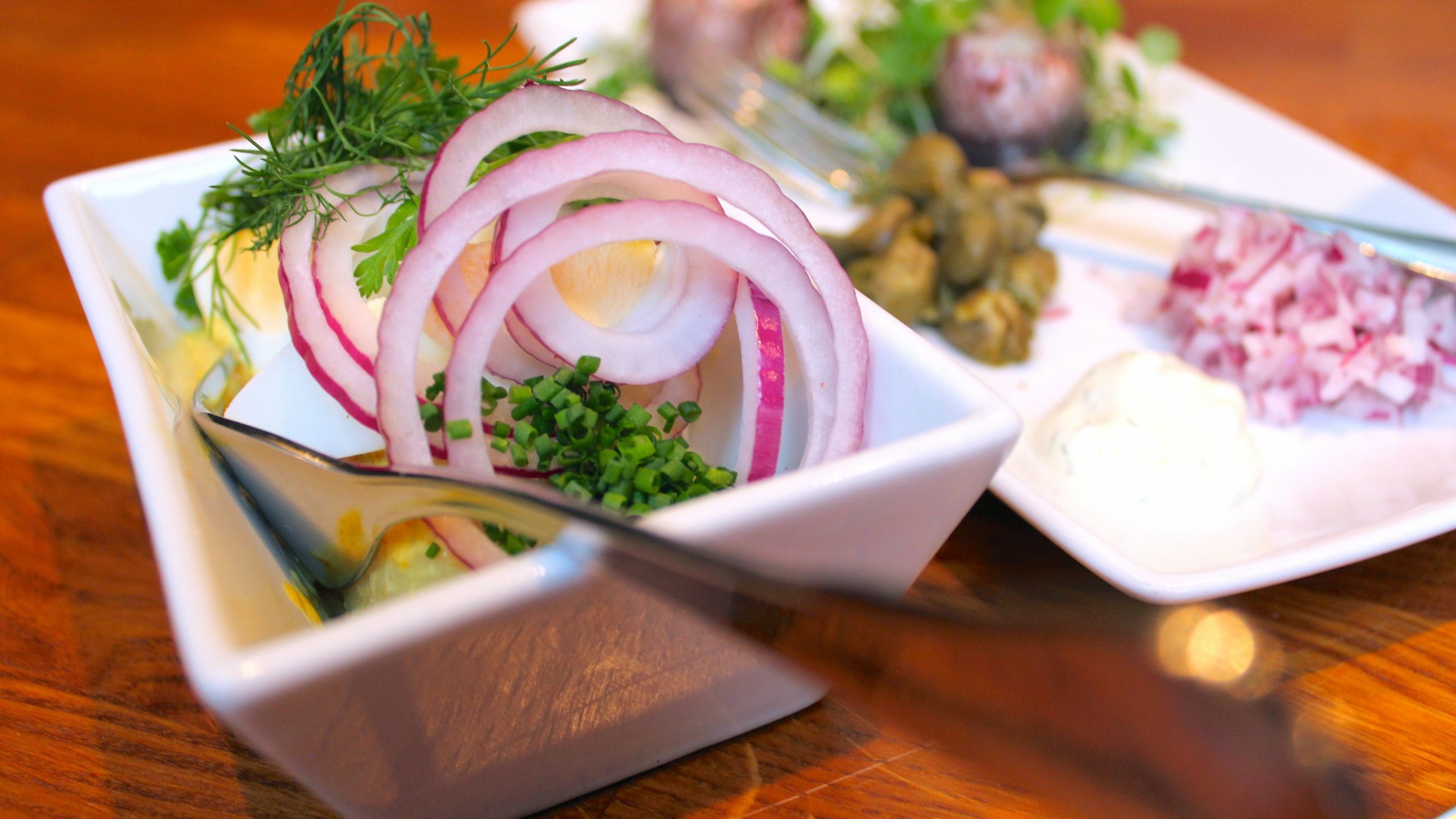 Christiansøpigens kryddersild med dildcreme, løg, kapers og peberrod.